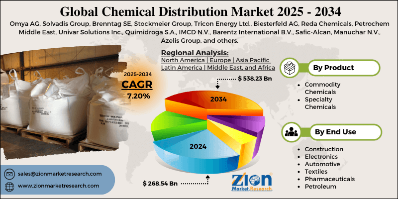 Browse the full “Chemical Distribution Market By Product (Commodity Chemicals and Specialty Chemicals), By End-User Industry (Construction, Electronics, Automotive, Textiles, Pharmaceuticals, Petroleum, and Others), and By Region - Global and Regional Industry Overview, Market Intelligence, Comprehensive Analysis, Historical Data, and Forecasts 2025 - 2034” Report at https://www.zionmarketresearch.com/report/chemical-distribution-market